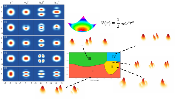 (一)虽然超冷原子是中性的,它们的轨道自由度不能直接感受到真实的磁场。但是近年来,人工磁场通过原子-激光相互作用的工程技术在几个先进的实验室创造出来。随着自旋轨道耦合(SOC)在冷原子实验中的实现,许多理论和实验工作得到了极大的发展,许多新奇的量子相和拓扑激发被人们发现探索。在拓扑量子计算,拓扑材料器件,高密度存储信息等方面具有较大的潜在应用价值。刘永恺教授团队最近研究发现一种新型涡旋分子结构,该结构涡旋呈现特殊分布,并且涡旋和涡旋之间通过domain-wall 连接,研究者对体系的基态相图进行了详细研究,并对该新奇拓扑量子态的定态和动态性质进行了相关数值研究。在规范场调节理论和拓扑学理论的基础上,研究者发现该涡旋分子态是一个组合拓扑结构,拥有铁磁相和反铁磁相的混合流形,其中铁磁相部分是一个标准的二维bimeron结构,对应拓扑数为1。这一研究成果以“Vortex molecules in a spin-orbit-coupled spin-1 condensate”为题,发表在著名非线性期刊Chaos,Solitons & Fractals(SCI一区//doi.org/10.1016/j.chaos.2024.115854),刘永恺为论文第一作者和通讯作者,2022级研究生高英峰为第二作者。