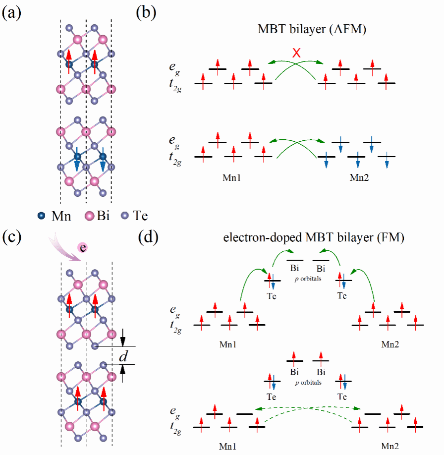 图 1(a, c) 具有层间AFM耦合的原始MBT双层和具有层间FM耦合的电子掺杂MBT双层的结构构型;(b, d) MBT和电子掺杂MBT双层中AFM和FM耦合示意图。
