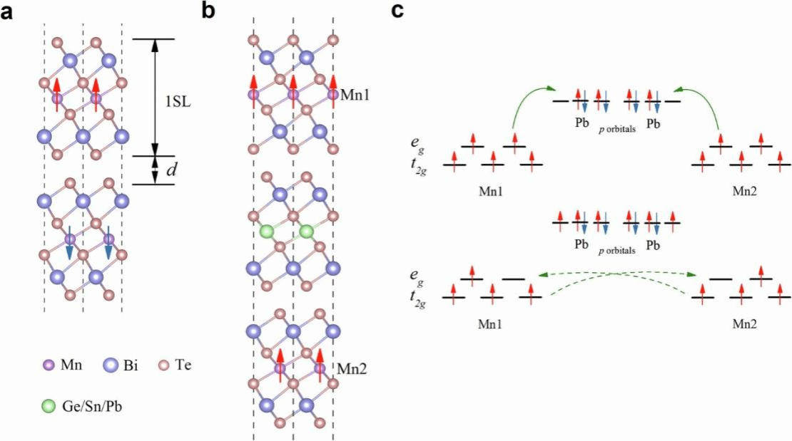 图 2(a, b) MBT双层和MBT/PBT/MBT异质结的晶体结构; (c)实现层间铁磁耦合的物理机制。