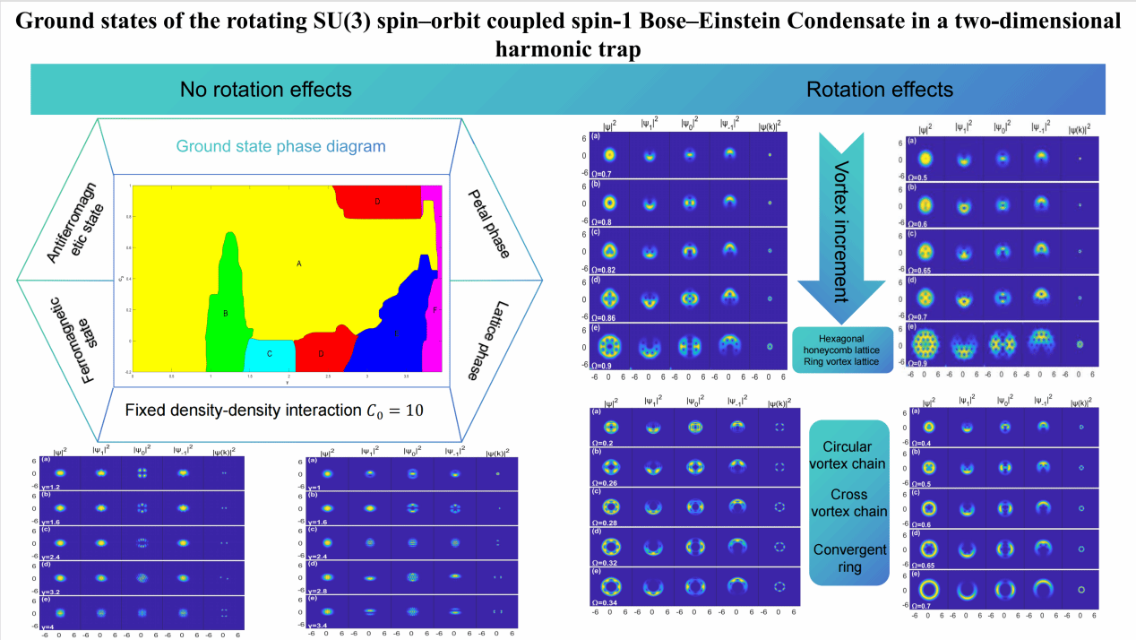 (一)随着自旋轨道耦合(SOC)在冷原子实验中的实现,许多理论和实验工作得到了极大的发展,许多新奇的量子相和拓扑激发被人们发现探索。在拓扑量子计算,拓扑材料器件,高密度存储信息等方面具有较大的潜在应用价值。近年来对自旋-轨道耦合的研究大多集中在SU(2)的类型上,即通过SU(2)泡利矩阵和动量耦合内部状态。为了更有效地描述三组分凝聚体之间的内部耦合,研究人员考虑了SU(3)自旋轨道耦合。刘永恺教授团队最近研究了一种新型SU(3)自旋-轨道耦合与外部旋转之间的协同效应下自旋为1的BEC中产生了特殊的涡旋分布。在反铁磁状态下,随着自旋轨道耦合的增加,系统经历了从奇特花瓣相、斜条纹相、到条纹晶格相的三种新型相变。在铁磁状态下,有四种类型的相图:花瓣与条纹混合相、横向条纹相、网状晶格和横向条纹晶格。受旋转频率的影响,系统表现多涡旋结构,如三角蜂窝相、U型涡旋链和六边形蜂窝晶格。在强自旋轨道耦合情况下,出现方格晶格,环状涡旋链。这一研究成果以“Ground states of the rotating SU(3) spin-orbit coupled spin-1 Bose-Einstein Condensate in a two-dimensional harmonic trap”为题,发表在Chinese Journal of Physics(SCI二区),刘永恺为论文通讯作者,2022级研究生高英峰为第一作者。