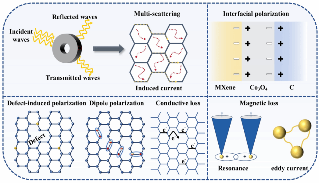 (二)在无线通信技术蓬勃发展的当下,电磁环境愈发复杂,电磁辐射对人体健康和设备正常运行构成威胁,高性能电磁吸波材料成为研究热点。传统生物质碳气凝胶因单一介电损耗和过高电导率导致阻抗失配,吸波性能欠佳。基于此,凝聚态与量子物理交叉团队蔡卓老师与合作者设计了壳聚糖/MXene/Co₃O₄复合气凝胶(CMCA),借助三维多孔结构与磁电协同损耗(壳聚糖和 MXene 提供介电损耗,Co3O4提供磁损耗)来优化阻抗匹配并增强电磁波耗散。该工作能够满足高吸收能力和轻量化,有望成为先进的电磁波吸收的关键材料。相关研究成果以“Chitosan/MXene/Co3O4-derived composite aerogels with hierarchically porous structure for electromagnetic wave absorption”为题发表在Applied Surface Science(SCI二区//doi.org/10.1016/j.apsusc.2025.162550)蔡卓为论文共同第一作者。
