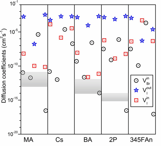 该工作解释了在不同有机阳离子作用下,异质结的阴离子扩散系数(如下图)。这些数据不仅揭示了不同阳离子对阴离子迁移速率的影响,而且为理解阴离子迁移的微观机制提供了关键信息。扩散系数的计算结果表明,对于所有的阳离子,构造面外的碘空位使得阴离子迁移具有最大的扩散系数,这意味着该空位缺陷对阴离子迁移的促进作用最强。