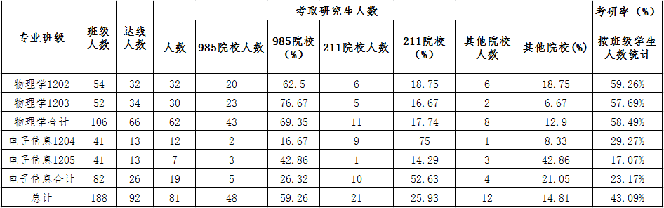 2012级(除免费师范生外)188名同学中,有92人达线,81人被最终录取,总考研率为43.1%。其中物理学专业106名毕业生中,有62人考取研究生,考研率为58.5%;电子专业82名毕业生中,有19人考取研究生,考研率为23.2%。今年考取研究生的81人中,985院校48人、211院校21人,考取985、211院校的比例占到了考取总人数的85.2%。