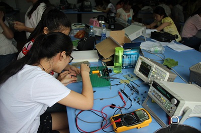 5月份,电子专业5名教师利用每天晚上和双休日,轮流对32个小组的96名同学进行了系统的电子设计培训和测试,他们分别从选题分析、设计思路、元器件选取、实物制作、故障分析和设计报告制作等方面对参加竞赛的学生展开培训。