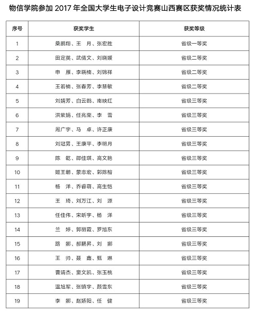 近日,2017年全国大学生电子设计竞赛山西赛区比赛落下帷幕,云顶Casino 选派的19组参赛作品全部获奖,其中一等奖1个、二等奖3个、三等奖15个,李竹、张志刚、王大为、崔艳等8位教师荣获“优秀指导教师”,再创佳绩。这是云顶Casino 继2003年、2015年之后第三次参加全国大学生电子设计竞赛。本次竞赛同2015年3组参赛及获奖情况相比,无论是学生参与积极性、报名规模、初选组数、最终参赛组数,还是作品质量、指导教师参与力度、获奖数量,都有了质的提高和飞跃。