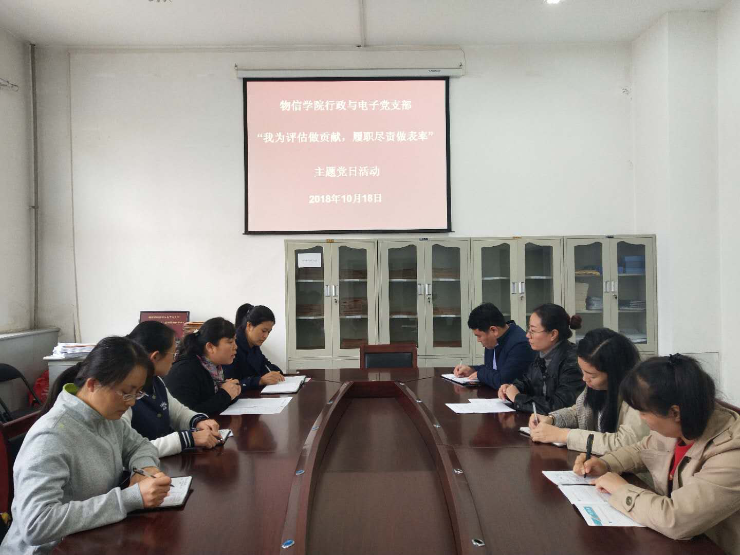 10月18日上午10:00,云顶Casino 行政与电子党支部在四号楼一层会议室开展了“我为评估做贡献,履职尽责做表率”主题党日活动,会议由支部书记卫永霞主持。