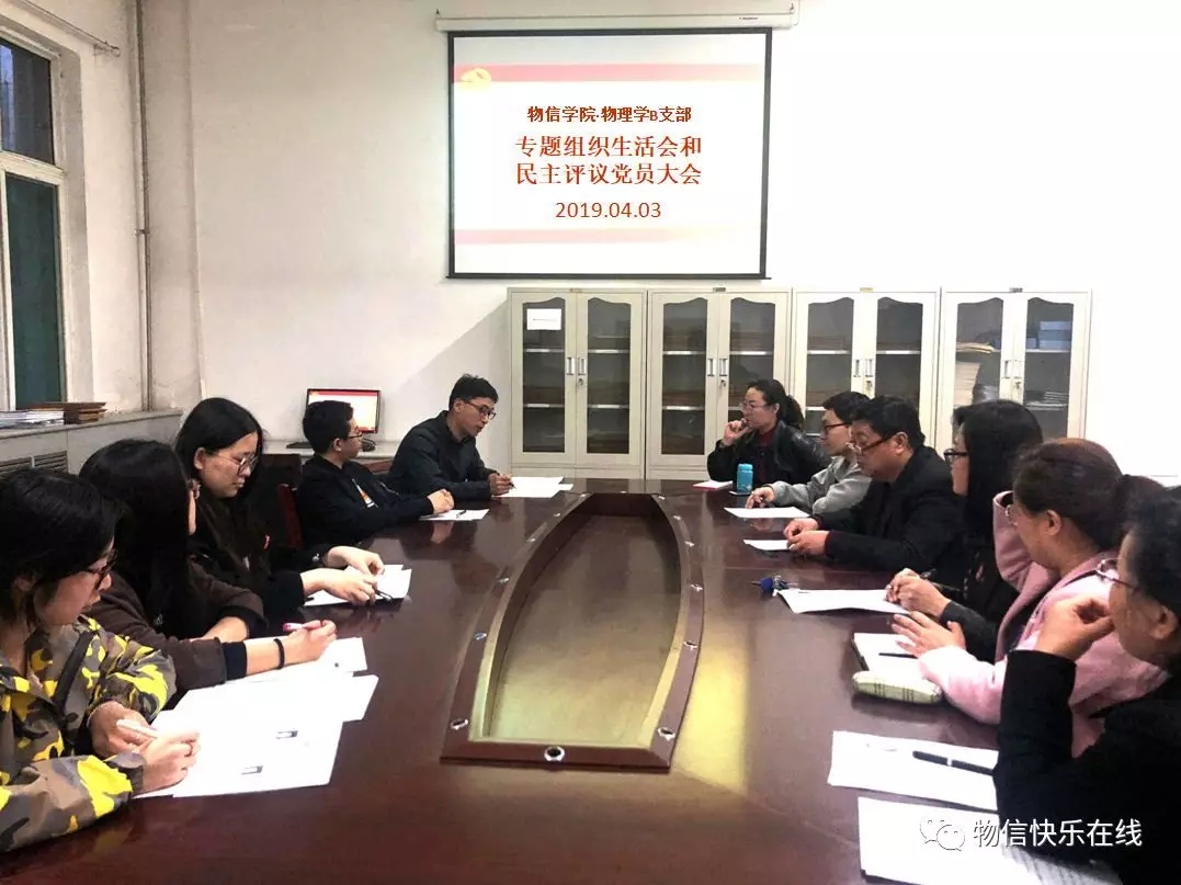 2019年4月3日19:00,云顶Casino 物理学B支部全体党员在04106会议室召开了2018年度支部专题组织生活会和民主评议党员大会。会议邀请了院党委副书记王玮参加并监督指导。会议由支部书记程留永主持。