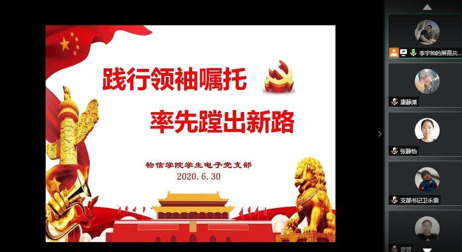 为庆祝中国共产党成立99周年,回顾党的光辉历史,继承和发扬党的优秀传统和优良作风,6月30日下午,学生电子党支部开展了“践行领袖嘱托,率先蹚出新路”线上主题党日活动。活动由支部委员李宇帅主持,全体党员参加了活动。