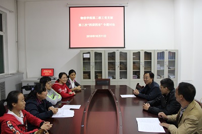 第二教工党支部全体党员在四号楼一层会议室召开“四讲四有”第三次专题讨论会议。