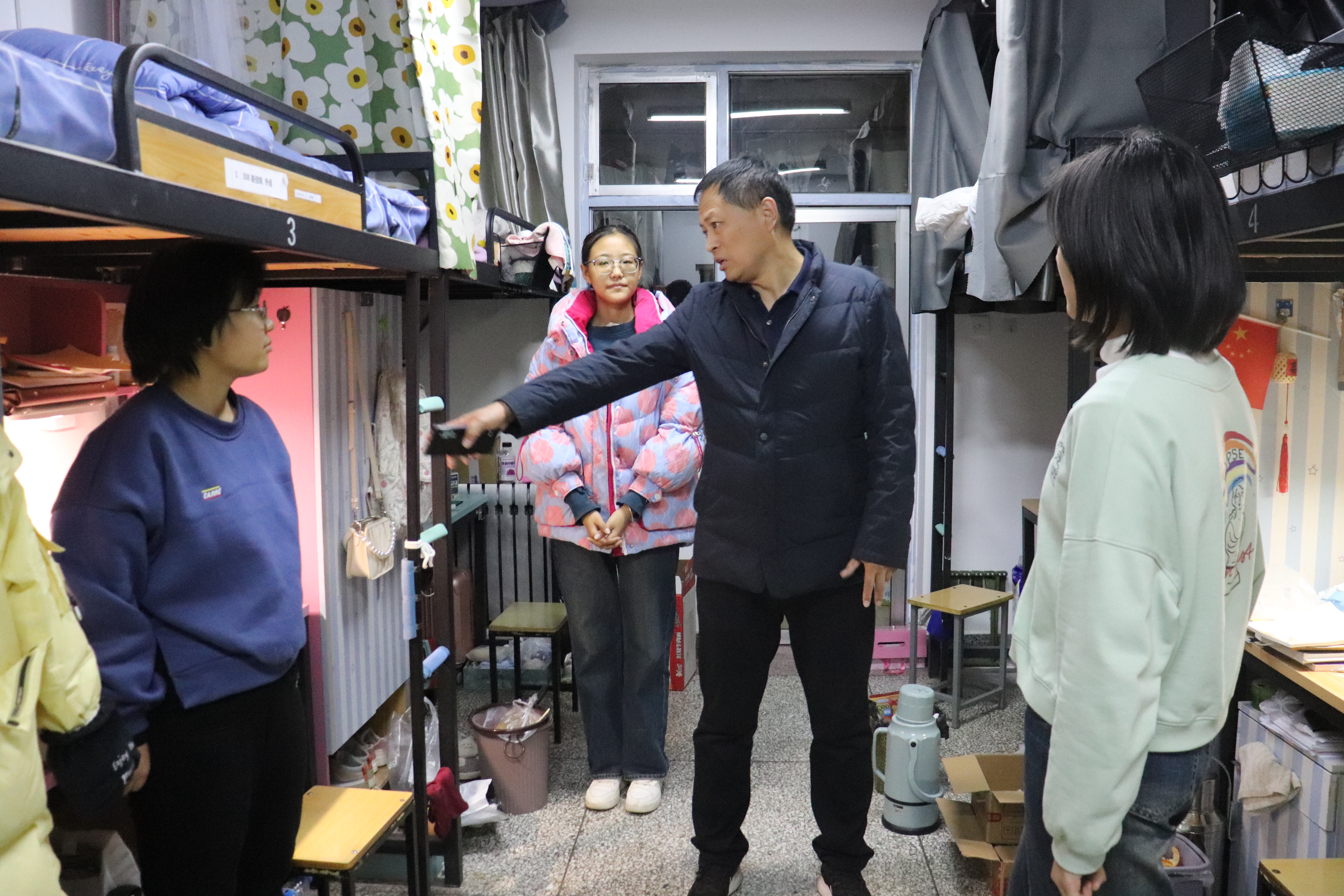 走访的过程中,老师亲切地与同学们交谈,了解同学们在宿舍生活中遇到的问题,详细排查了学生宿舍安全情况。他们向学生们指出了宿舍潜在的火灾安全隐患,同时耐心叮嘱同学们不要在宿舍使用大功率用电器、不要堆放杂物。通过和同学们分享关于宿舍火灾的新闻,教育引导同学们重视宿舍安全卫生,定期开展隐患排查,打造温馨安全干净整洁的宿舍生活环境。同学们对领导的访问深感温暖,并表示会时刻谨记宿舍安全,时常排查安全隐患。