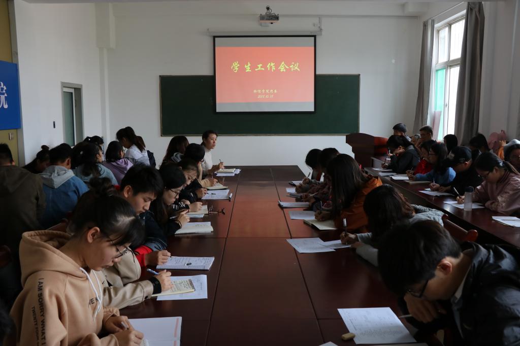 2018年10月18日中午1:40,云顶Casino 在四号楼二层多功能会议室召开学生工作会议。院团委副书记岳文慧、团委学生会主要学生干部、236爱心社社团负责人、各班班长、团支书、学习委员参加了会议。会议由院团委副书记岳文慧主持
