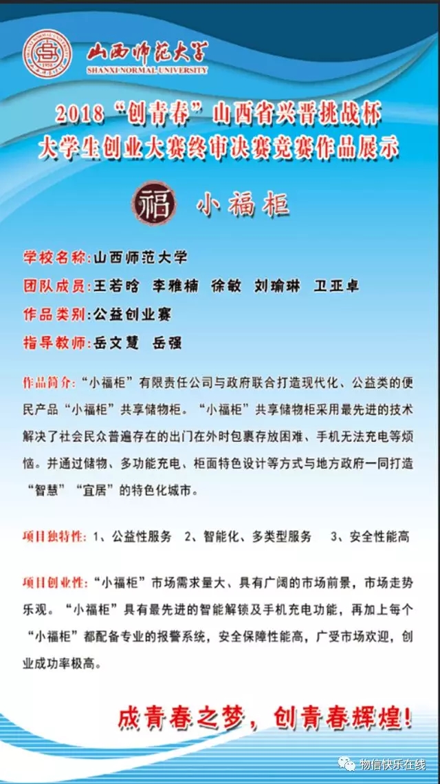 王若晗团队获得“公益创业类”银奖,团队成员有卫亚卓、李雅楠、徐敏、刘瑜琳,她们展示了方便市民的“小福柜”共享储物柜。