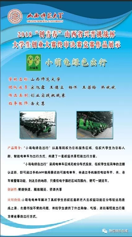 宋旭露团队获得“创业实践类”银奖,团队成员有王德立、杨怀、王若晗、韩斌斌,他们展示了给师大学子带来了极大便利的“小萌龟”优驱电单车;