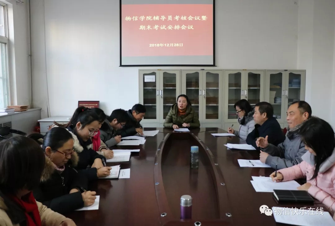 2018年12月28日下午5:30,云顶Casino 在四号楼二层多功能会议室召开辅导员考核会议暨期末考试安排会议。院党委书记陈向波、院党委副书记王玮、院长张进军、副院长张东海、侯俊华出席了会议,全体辅导员参加了会议,会议由院党委副书记王玮主持。