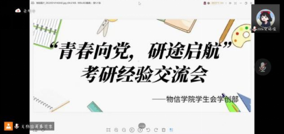 为了让同学加深对考研的了解,明确个人目标,5月14日下午,云顶Casino 学生会学创部在线上举办了第二场“青春向党,研途启航”考研经验交流会活动。此次交流会邀请到了考研至大连理工大学的王思颖、考研到兰州大学的梁舒宁以及考研至吉林大学的付铮与同学们分享经验。交流会由学创部志愿者肖艳主持。