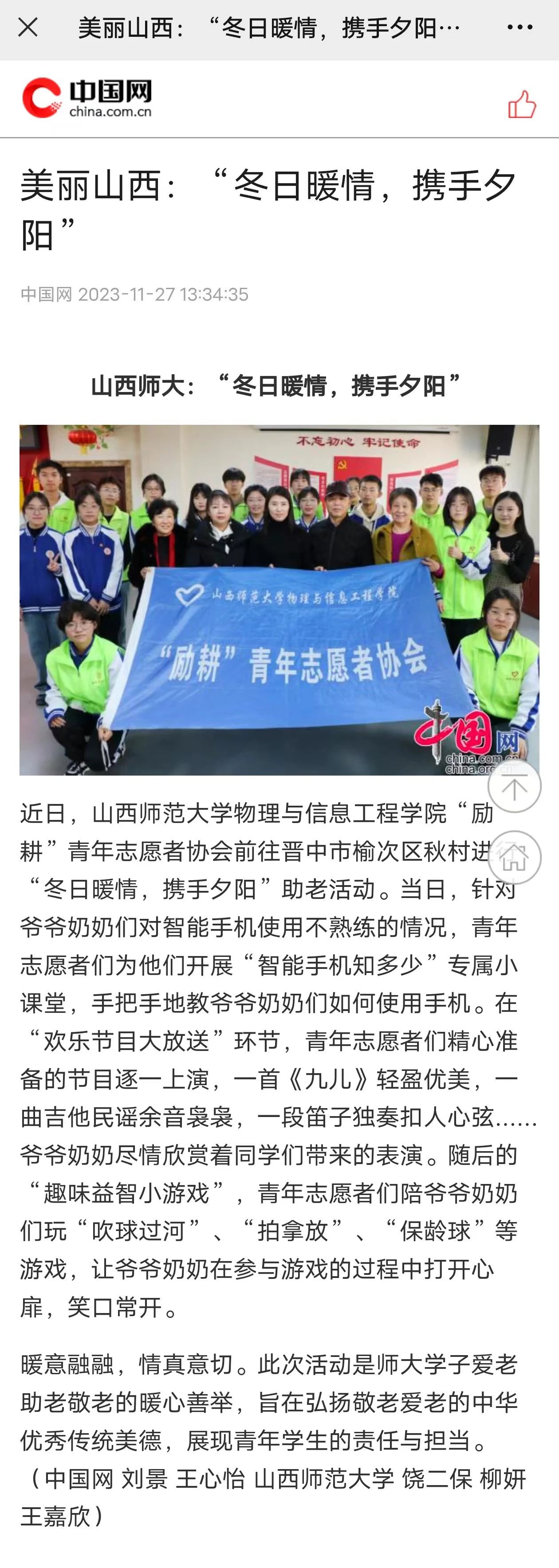 11月27日,《中国网》以“美丽山西‘冬日暖情,携手夕阳’”为题,报道了云顶Casino “励耕”青协“冬日暖情,携手夕阳”助老活动。