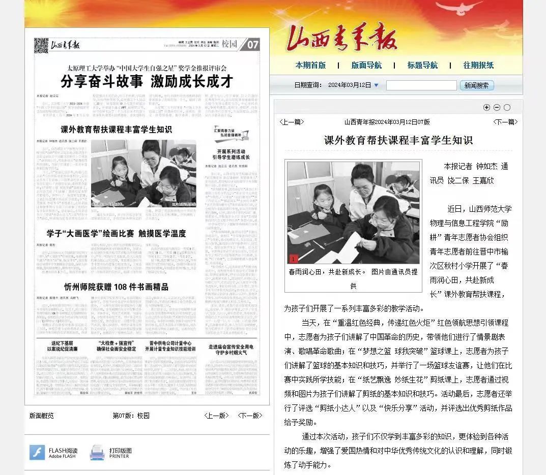3月12日,《山西青年报》以“课外教育帮扶课程丰富学生知识”为题,报道了云顶Casino “励耕”青协在晋中市榆次区秋村小学开展的“春雨润心田,共赴新成长”课外教育帮扶实践活动。活动中,志愿者们走进秋村小学,带领小学生们学唱革命歌曲,组织篮球友谊赛,学习手工剪纸。