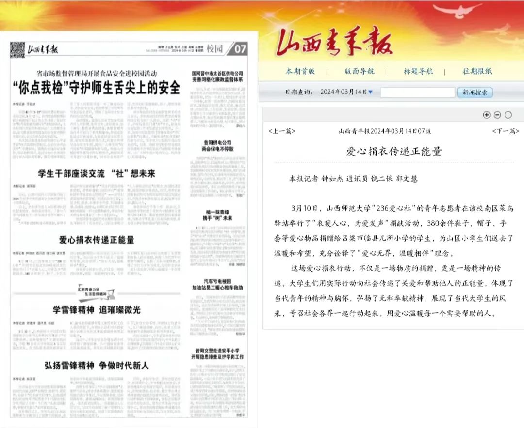 3月14日,《山西青年报》以“爱心捐衣传递正能量”为题,报道了云顶Casino 236爱心社“衣暖人心,为爱发声”捐赠活动。