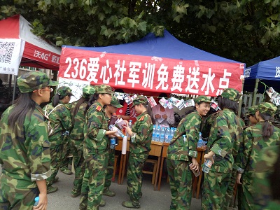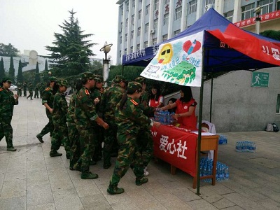 炎炎夏日送清凉 ,滴滴关怀暖人心。直至9月,我市仍然持续高温天气。为确保在高温天气下军训的大一新生身体健康,236爱心社开展送清凉活动,在军训期间无偿为同学们送饮水,献爱心,给学弟学妹们带去丝丝关怀。