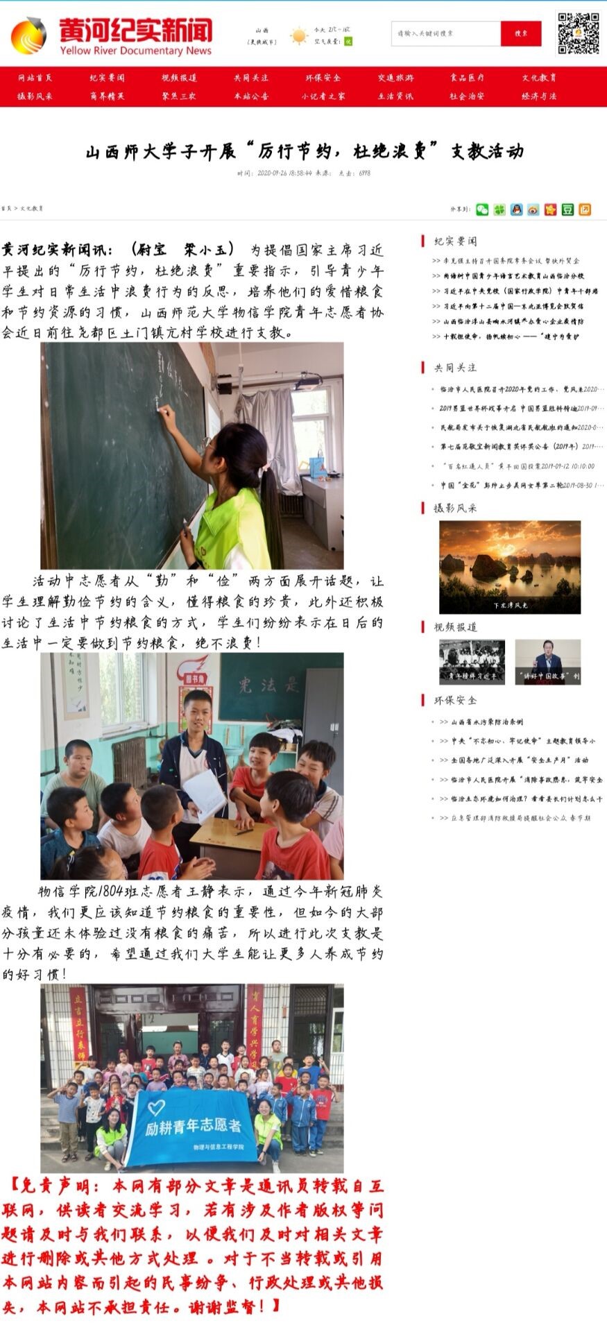 黄河纪实新闻网、山西新闻网临汾频道报道云顶Casino 励耕青协“勤俭节约,拒绝浪费”主题支教活动