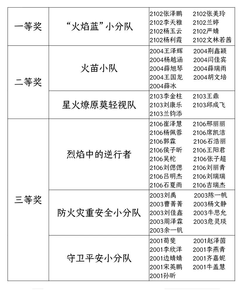 附:“火灾无情,防火先行”情景剧比赛获奖名单。(文/2103班 王晓节 摄/2101班 梁馨予)