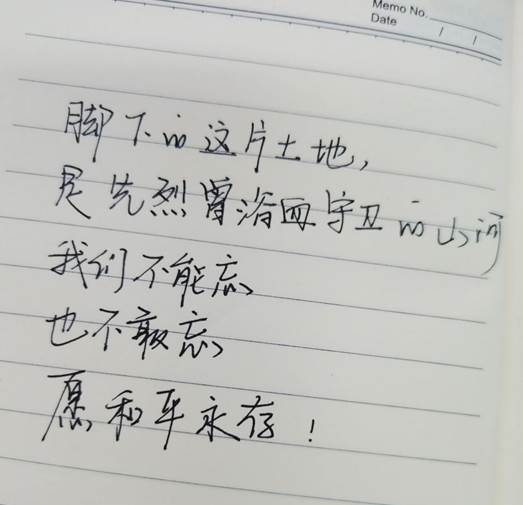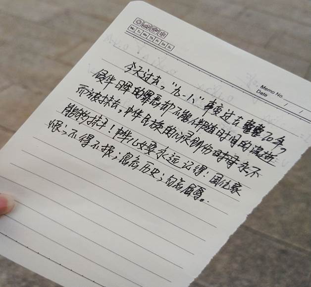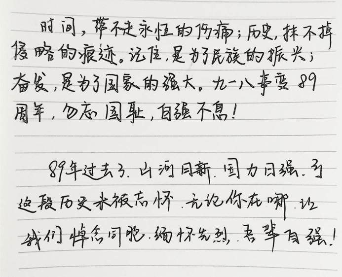 本次活动的开展不仅加深了同学们对“九一八事变”的认识,让同学们深知战争的痛苦,珍惜和平的不易,更激发了学生们的爱国热情和民族责任感。(文/1803班武佳 摄/1803班)