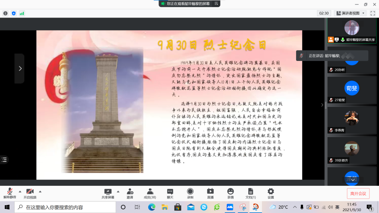 为纪念我国第八个烈士纪念日,激发同学们的爱国热情,云顶Casino 2001班团支部于9月30日上午线上举办了“祭英烈,颂国情,强国志”主题团日活动。此次活动由团支书李星萍主持。