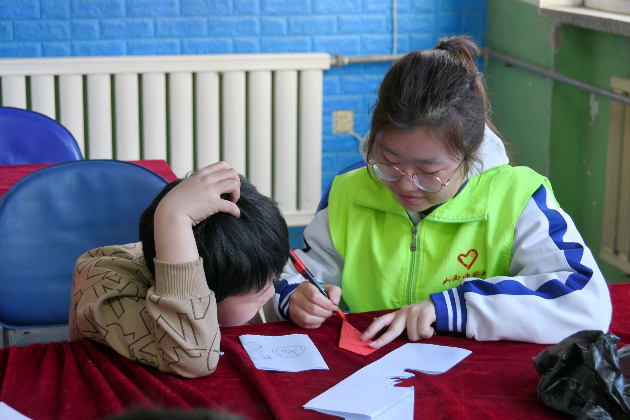 在本次活动中,主要分为了篮球教学、剪纸练习以及红色领航三个板块。在篮球课上,志愿者们耐心地为孩子们讲解了传球、防守、投篮等基本规则、技巧和战术;在剪纸活动中,志愿者们为孩子们讲解了剪纸的历史渊源、基本技巧和创作方法。孩子们跃跃欲试,充分发挥自己的想象力和创造力,剪出了各种精美的图案,他们相互交流、学习,共同进步;在红色领航中,志愿者们通过击鼓传花、唱歌等活动形式,讲述了党的光辉历史、革命先烈的英雄事迹。