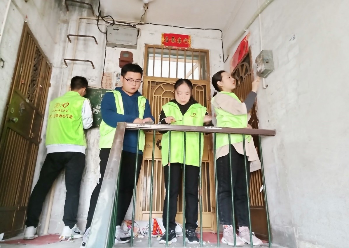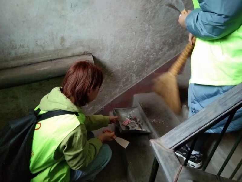 活动中,志愿者们首先了解了家属楼内的具体情况,在确定清扫的对象和工作方式后开始了打扫,主要打扫内容是清理墙上和楼梯上的小广告。在打扫过程中,志愿者们拿着铲子、喷壶等工具,一张一张的将小广告喷湿并铲除,不放过每一个死角。