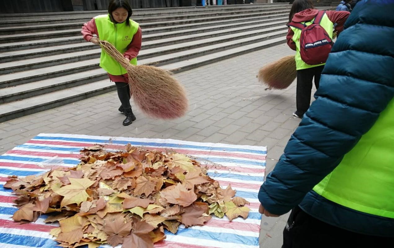 活动中,首先负责人划分并分配清扫场地,随后志愿者们有序展开了清扫活动,大家分工明确,积极清扫。最后,志愿者们将落叶倒至垃圾箱,并归还清扫工具。