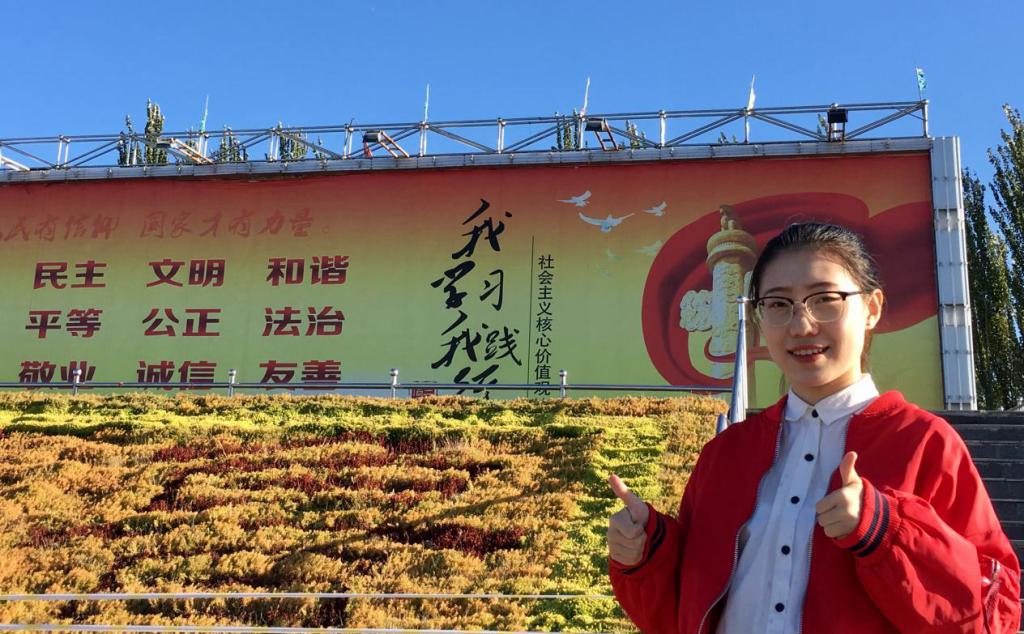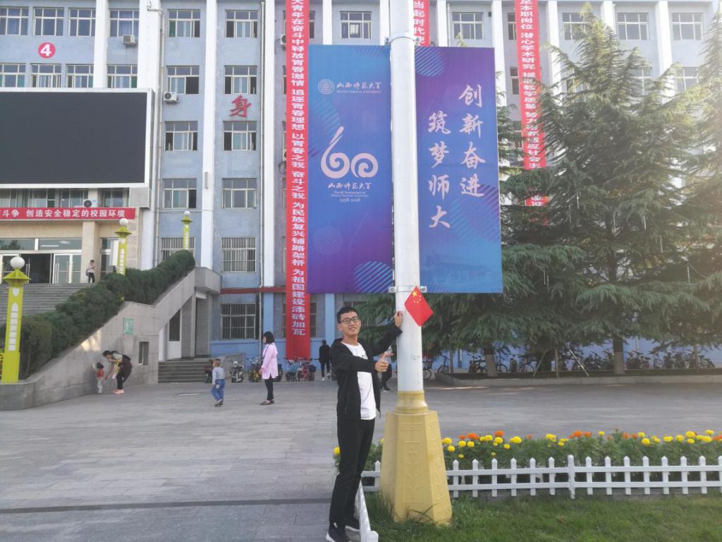 在祖国生日到来之际,特献本人礼赞祖国照片一张以表对祖国母亲的热爱之情,图中我的后面是今年我校60周年校庆主题“创新奋进,筑梦师大”寓意我们将在师大的学习生活中,不断创新奋进,在师大筑梦,为祖国母亲的伟大复兴与中国梦的实现挥洒上自己的汗水与青春。