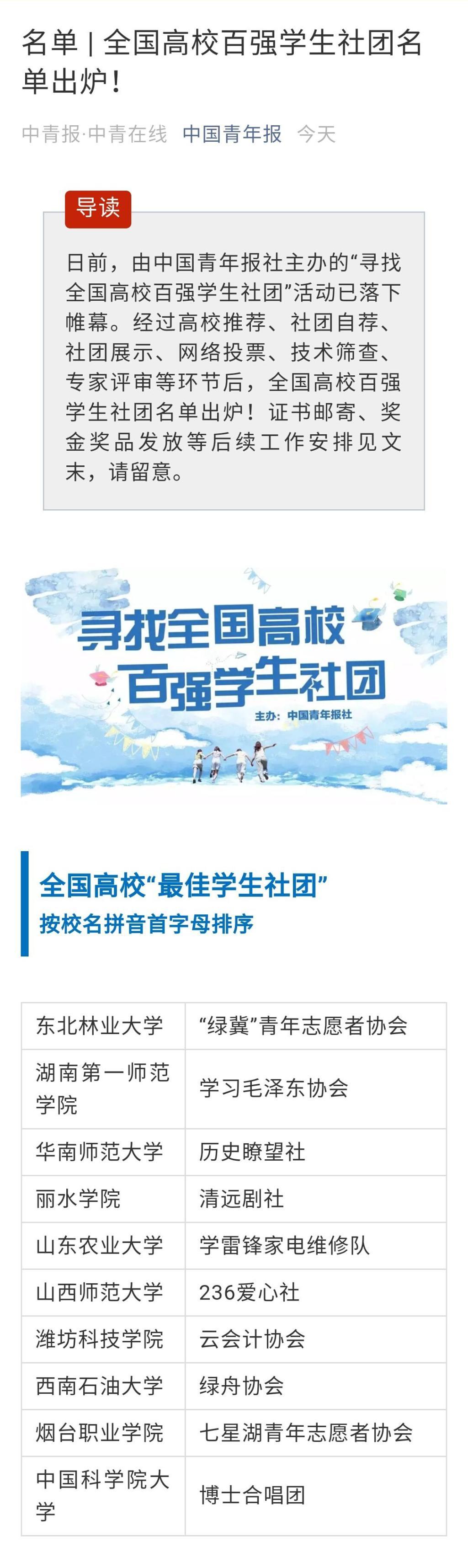 日前,由中国青年报社主办的“寻找全国高校百强学生社团”活动已落下帷幕。全国高校百强学生社团名单于6月24日出炉,我院236爱心社入选全国高校“最佳学生社团”,位列全国十强,山西省高校仅此一家。