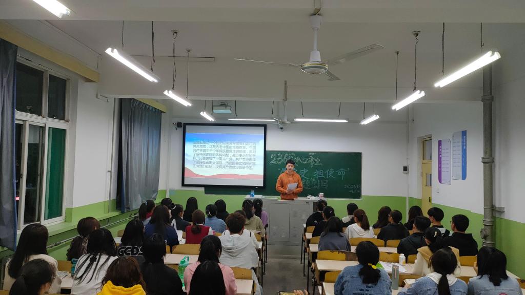 活动中,党龙辉简述了中国共产党诞生的历史背景,回顾了共产党从创立到现在的艰难历程。随后,他带领大家观看了短片“画说党史”,并指出只有中国共产党才能救中国,只有坚持中国共产党的领导才能发展中国。党为人民舍身奉献,我们更应积极树立共产主义远大理想,做有理想、有本领、有担当的青年。