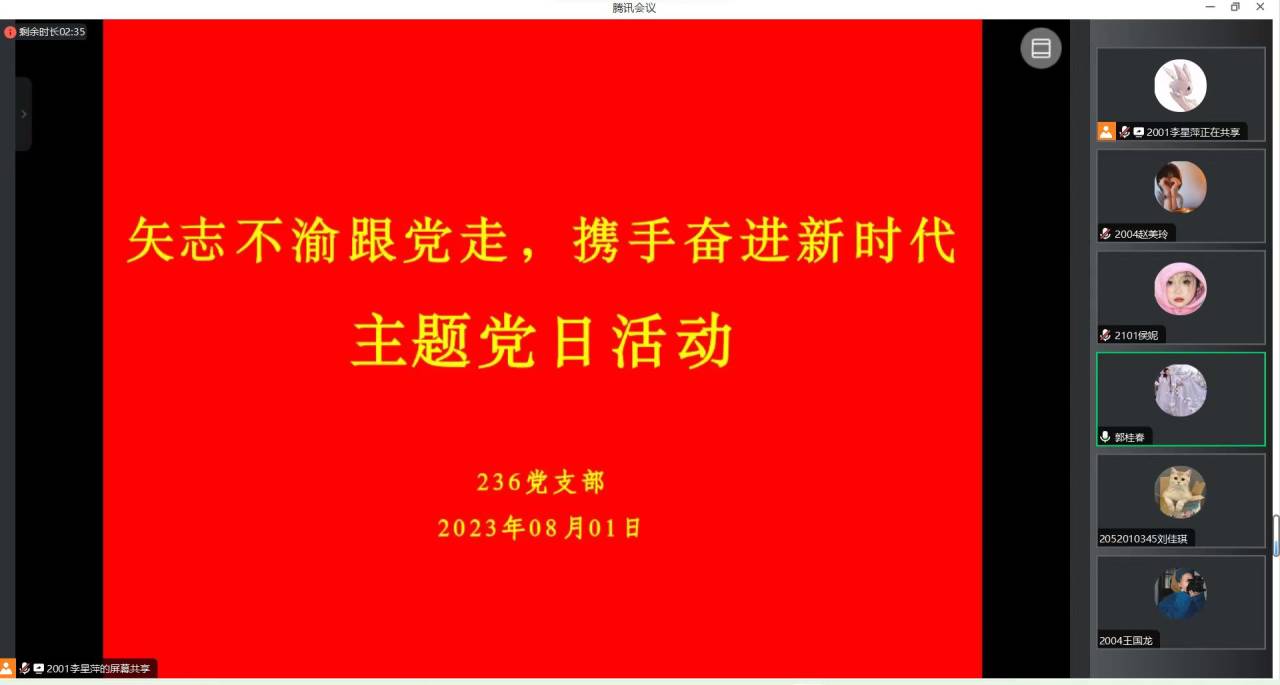 8月1日晚,云顶Casino 236党支部通过腾讯会议召开了“矢志不渝跟党走 携手奋进新时代”线上党日活动。本次活动由支部党员李星萍主持,支部全体党员参加了活动。