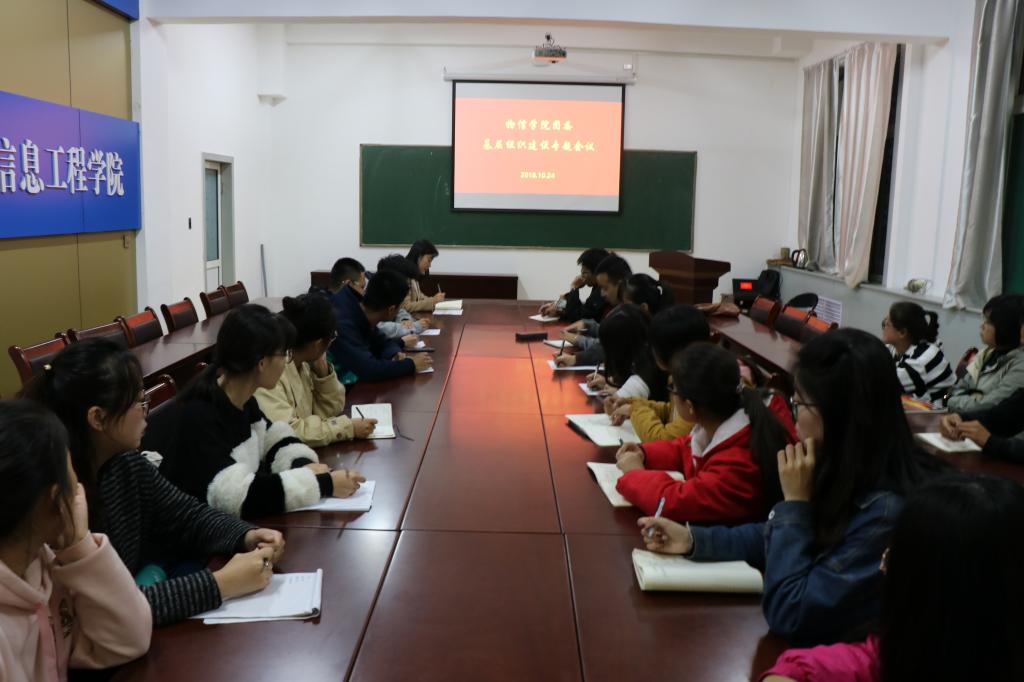 2018年10月24日晚6:20,云顶Casino 团委在四号楼二层多功能会议室召开基层组织建设专题会议。院团委副书记岳文慧、院团委学生干部及各班团支书参加了会议。会议由院团委副书记岳文慧主持。