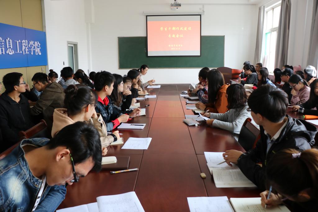 2018年10月18日中午12:00,云顶Casino 在四号楼二层多功能会议室召开学生干部作风建设专题会议。院团委副书记岳文慧、团委学生会主要学生干部、各班主要班干部参加了会议。会议由院团委副书记岳文慧主持。