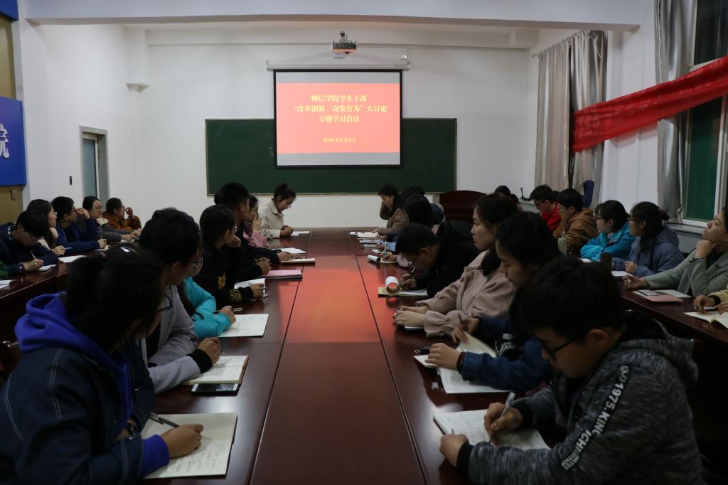 2019年3月5日晚7:00,云顶Casino 在四号楼二层多功能会议室召开学生干部“改革创新、奋发有为”大讨论专题学习会议。院团副委副书记岳文慧、专职辅导员马丽娜、各班班长、团支书参加了会议。会议由院团委副书记岳文慧主持。