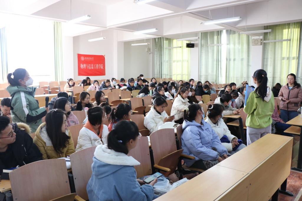 活动中,赵昱倩就提高成绩和保研面试两方面给大家做了介绍,她指出优秀的成绩是重中之重,要想提高成绩,一定要在平时下功夫,上课认真听讲、做好笔记,课下要自律学习,她还表示,在保研面试过程中心态很重要,要自信、落落大方,不怯场,才能展示出个人的真正水平。田宇鑫从保研要求、推算排名计算方法、保研公众号、学校查询、夏令营申请和院校选择等方面为同学们讲解了相关知识技巧,她特别强调了英语四六级证书的重要性,鼓励同学们认真备考,全力以赴对待四六级考试,并呼吁同学们积极参加挑战杯、物理学术竞赛等比赛,丰富自身经历的同时提高个人的专业素养。