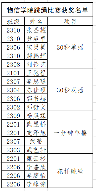 本次活动的顺利举办,提高了同学们的跳绳技能和身体素质,培养了同学们奋力拼搏、永不放弃的体育精神,充分展现了物信学子朝气蓬勃,健康向上的精神风貌。(文/2306班 薛妙青 摄/2304班 张玮珊)