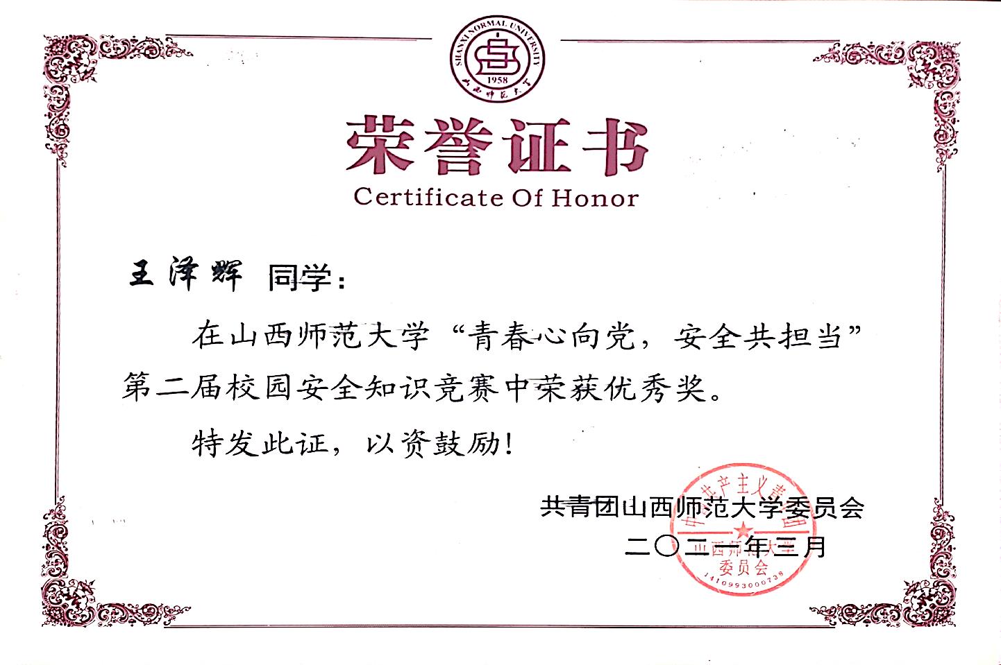 第二届校园安全知识竞赛优秀奖