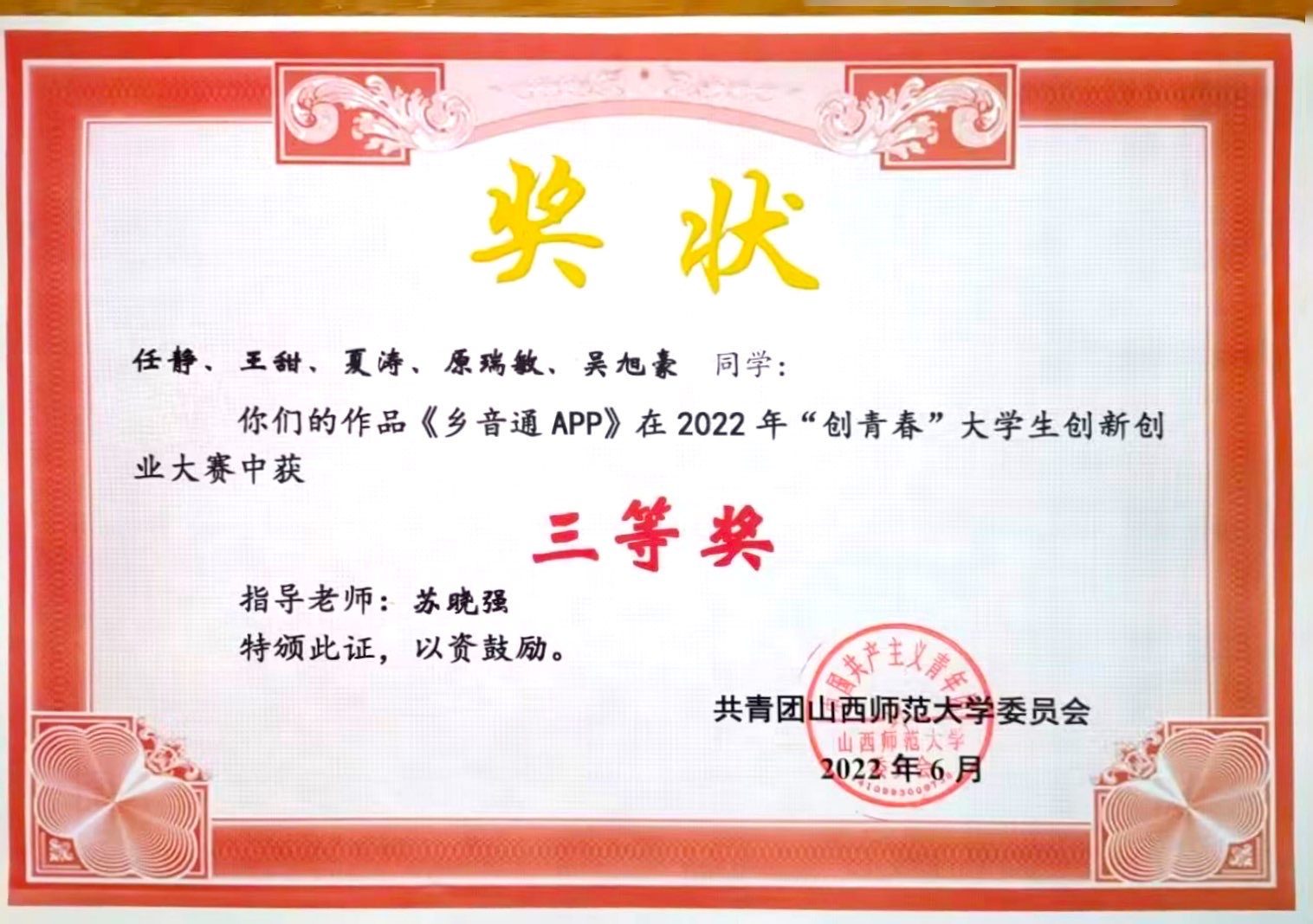 2022.05“创青春”大学生创新创业大赛校级三等奖