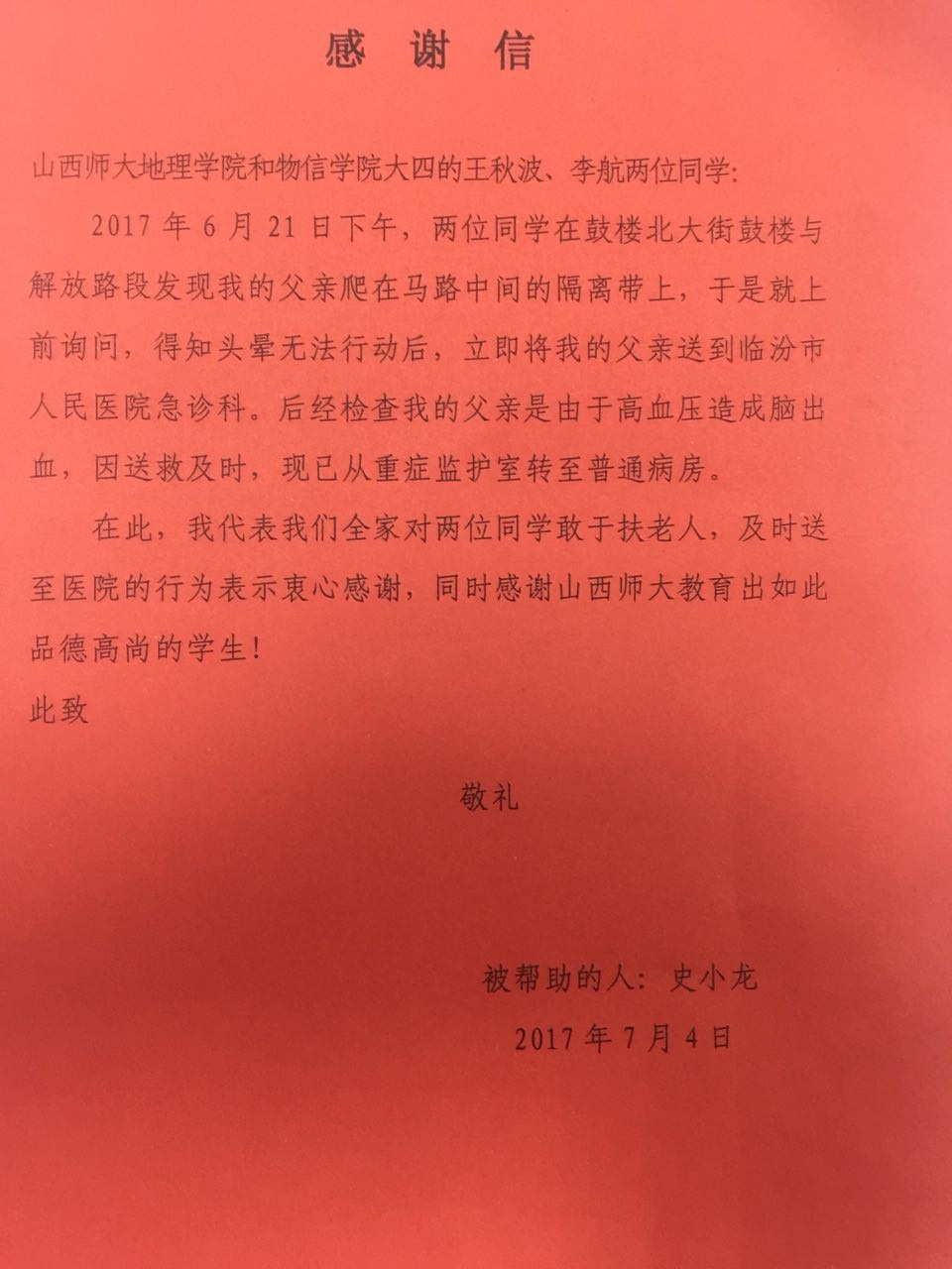 学生王秋波,在鼓楼北大街鼓楼与解放路段发现一位高龄老人爬在马路中间的隔离带上,于是上前询问。当得知老人因头晕而无法行走时,两人立即冒雨将老人送往临汾市人民医院急诊科。经诊断,老人是因患高血压而引发的脑溢血,由于救治及时,老人现已脱离危险,从重症监护室转至普通病房。两位同学“雨中救助病危老人”的先进事迹深深地感动了病人家属,也感动了各大主流媒体。