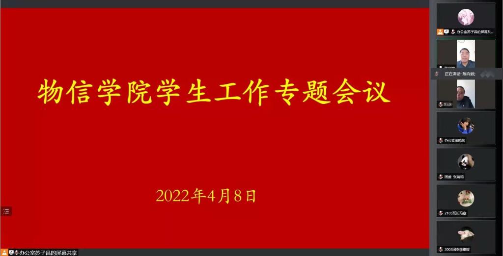 4月8日中午,云顶Casino 以线上方式召开了学生工作会专题会议,院党委书记陈向波、新任院党委副书记颜志刚出席会议,各班辅导员、各党支部书记、各党支部的学生支部委员、各班班长团支书、团委学生会、236爱心社的主要学生骨干参加了会议。会议由院团委副书记马丽娜主持。