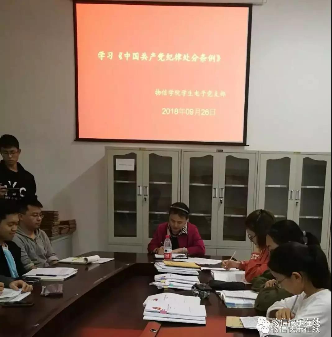 2018年9月26日晚6:50,云顶Casino 学生电子党支部在四号楼一层会议室召开《中国共产党纪律处分条例》专题学习会议,全体党员、预备党员共计13人参加了会议,会议由支部书记崔艳主持。