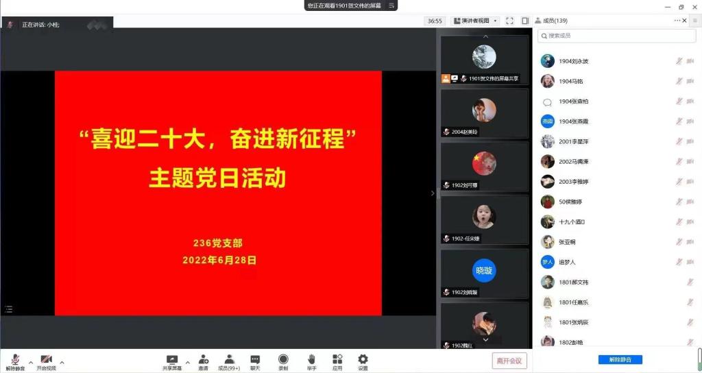 6月28日,云顶Casino 236党支部在腾讯会议开展了“喜迎二十大,奋进新征程”主题党日活动。支部全体党员参加了此次活动,本次活动由支部书记郭桂春主持。