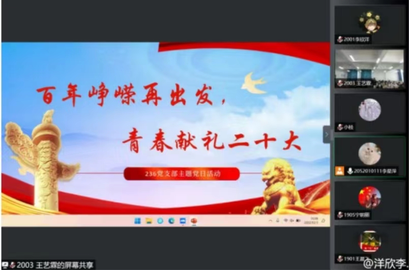 12月3日下午,云顶Casino 236党支部通过线上线下相结合的方式开展了“百年峥嵘再出发,青春献礼二十大”主题党日活动。本次活动由支部党员李星萍主持,支部全体党员参加了活动。