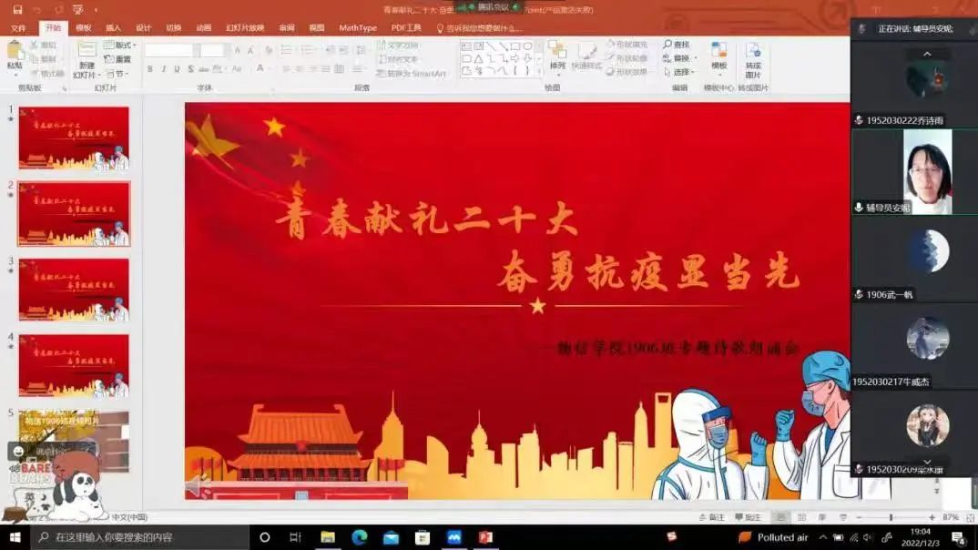 为深入学习贯彻党的二十大精神,展现疫情期间青年学生的精神风貌,12月3日晚,云顶Casino 1906班于线上开展了“青春献礼二十大,奋勇抗疫显当先”主题班会活动。班会由辅导员安妮主持。