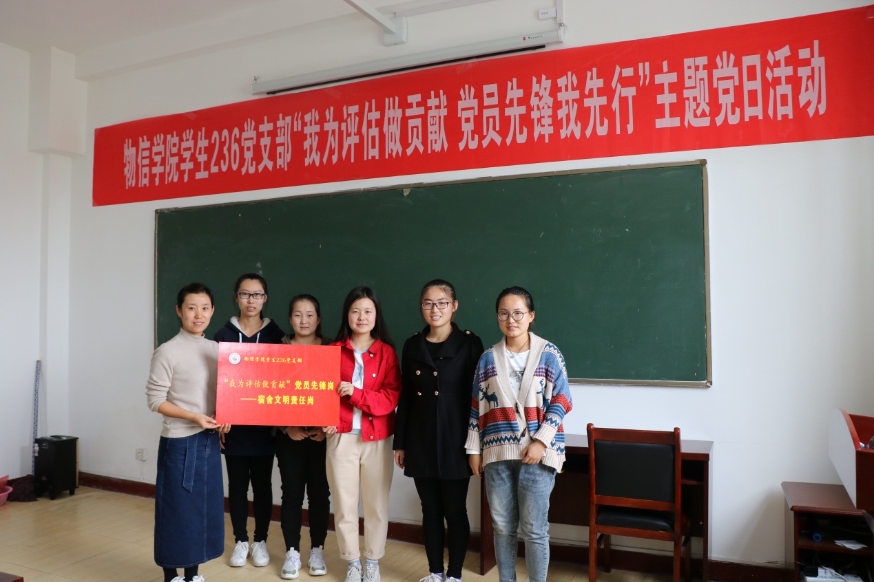 为进一步将评估工作内化于心、外化于行,236党支部专门设立“我为迎评做贡献”党员先锋岗之“宿舍文明责任岗”、“评估知识宣讲岗”、“课堂纪律督查岗”、“志愿服务先行岗”,举行了挂牌仪式,在课堂纪律监督、评估知识宣讲、测试等方面将发挥积极作用。