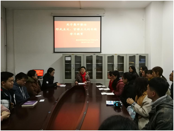 会议按照集中整治形式主义、官僚主义工作的要求,针对支部工作中存在的问题进行调研,崔艳老师指出目前支部工作中还存在一些问题,主要有满足于学习传达的文件精神,没有应用到具体的学习与工作中,仅停留在文件的学习与传阅上,党员学习形式单一,影响学习效果。