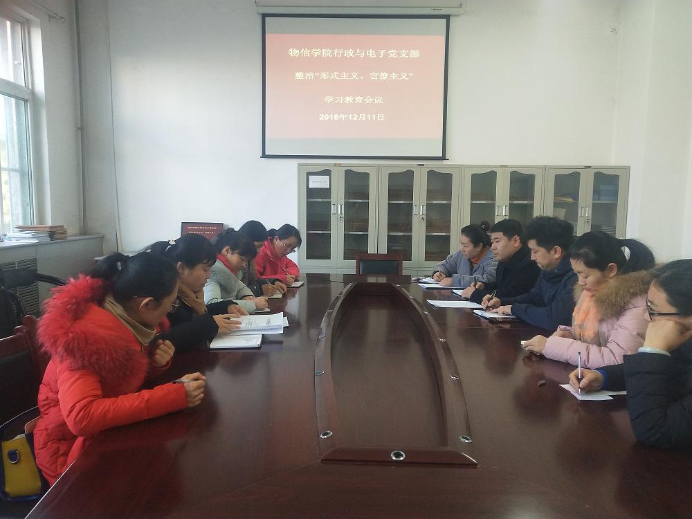 12月11日上午10:00,在四号楼一层会议室行政与电子党支部开展了整治”形式主义、官僚主义”学习教育会议,会议由支部书记卫永霞主持。